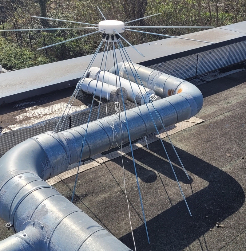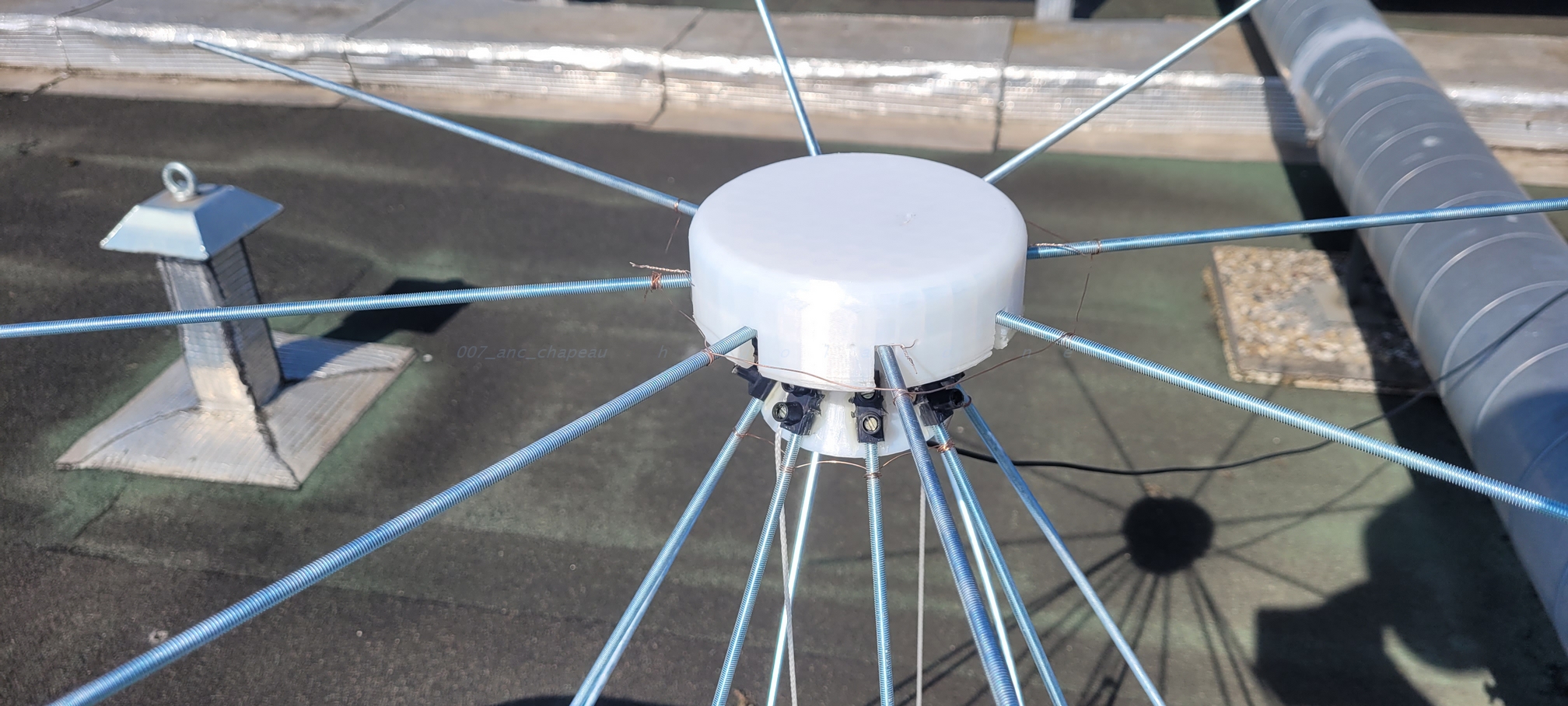article précédent, la discône était posée à même le sol (ou en tout cas, la dernière couche de feuille d'étanchéité de la toiture), attachée par une ficelle à un tuyau passant entre les radiales de la partie GND.