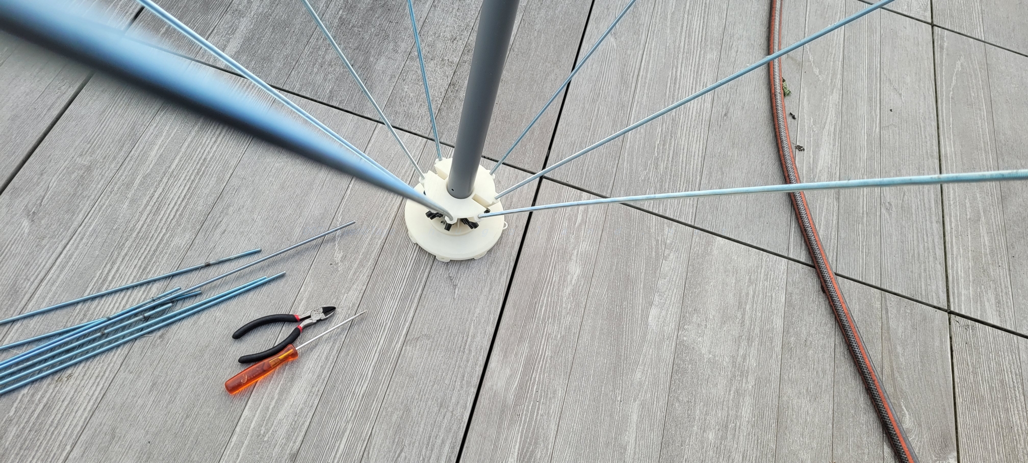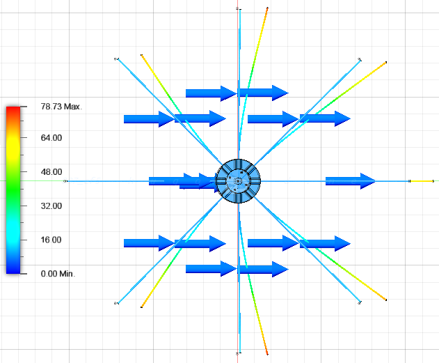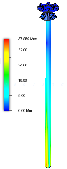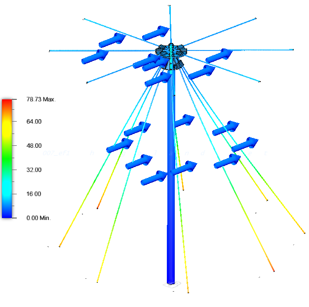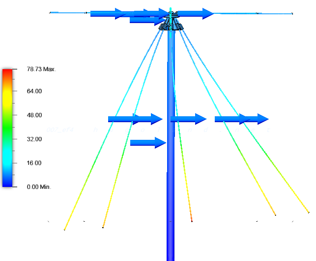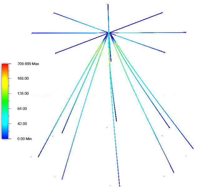 Les éléments qui subissent le plus le vent sont les radiales en acier, qui sont assez fines. La contrainte est élevée au niveau où elles sont tenues, mais cette contrainte de 208 MPa reste inférieure aux valeurs couramment admissibles pour de la boulonnerie en acier, à savoir, pour de la boulonnerie vendue comme de la classe 4.8 : 400×0,8 = 320 MPa. Nous avons donc pour les tiges un facteur de sécurité de 320/208 = 1,54 ce qui est parfait (supérieur à 1,5 - inutile de faire plus car contrairement au plastique imprimé, il n'y a aucune incertitude supplémentaire sur les tiges en acier).