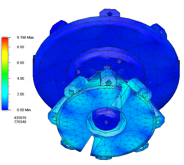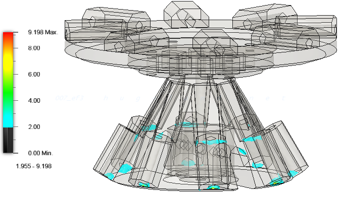 Notons que le logiciel considère la pièce centrale (imprimée en 3D) comme en plastique plein, alors qu'en réalité, l'impression 3D crée une pièce creuse avec des hexagones structurels (ce qui dure 5h d'impression pour ce modèle, tout de même), et non une pièce pleine qui aurait sûrement pris des jours et des jours à imprimer, pour aucun gain. Il convient donc de prendre en compte la contrainte au niveau de la surface de la pièce (appui des radiales sur le plastique), ainsi que les endroits où l'on sait que le plastique est à peu près plein (dans les petits rectangles d'insertion des tiges, par exemple, qui sont assez fins donc forcément pleins), mais pas le reste, car il n'indique pas si la pièce résiste dans son ensemble - d'où l'intérêt de l'avant dernière image ci-dessus. C'est quand même suffisant pour donner une idée du comportement mécanique, et donc d'en conclure que l'assemblage fonctionne. Si l'on considère que l'ABS peut tenir une contrainte caractéristique de 34 MPa, pour une contrainte calculée par le logiciel de 9 MPa, il paraît très raisonnable de disposer d'un facteur de sécurité 34/9 = 3,7. Si l'on calculait cette pièce comme un bâtiment, le coefficient ELU aurait été 1,5.