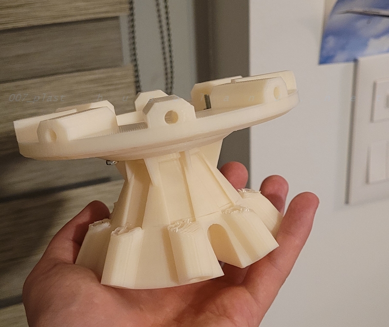 Les photos de l'impression du cône en plastique sont ci-dessous. Cette partie contient en bas un système pour y introduire et boulonner le tube PVC, et en partie haute un système pour visser l'autre pièce imprimée dont je parle plus bas. Quelque soit l'orientation de la pièce (à l'endroit ou à l'envers - ici le moins pire était d'imprimer la pièce à l'envers), trop de matière dépasse horizontalement, donc des piliers support étaient nécessaires (en l'occurrence, pour tenir le retour des éléments qui tiendront les radiales de la partie cône du discône). Cependant ceux-ci n'ont pas très bien collé au tapis, et j'ai dû ajouter en cours d'impression des petites cornières en acier lestées par des cailloux pour les retenir.