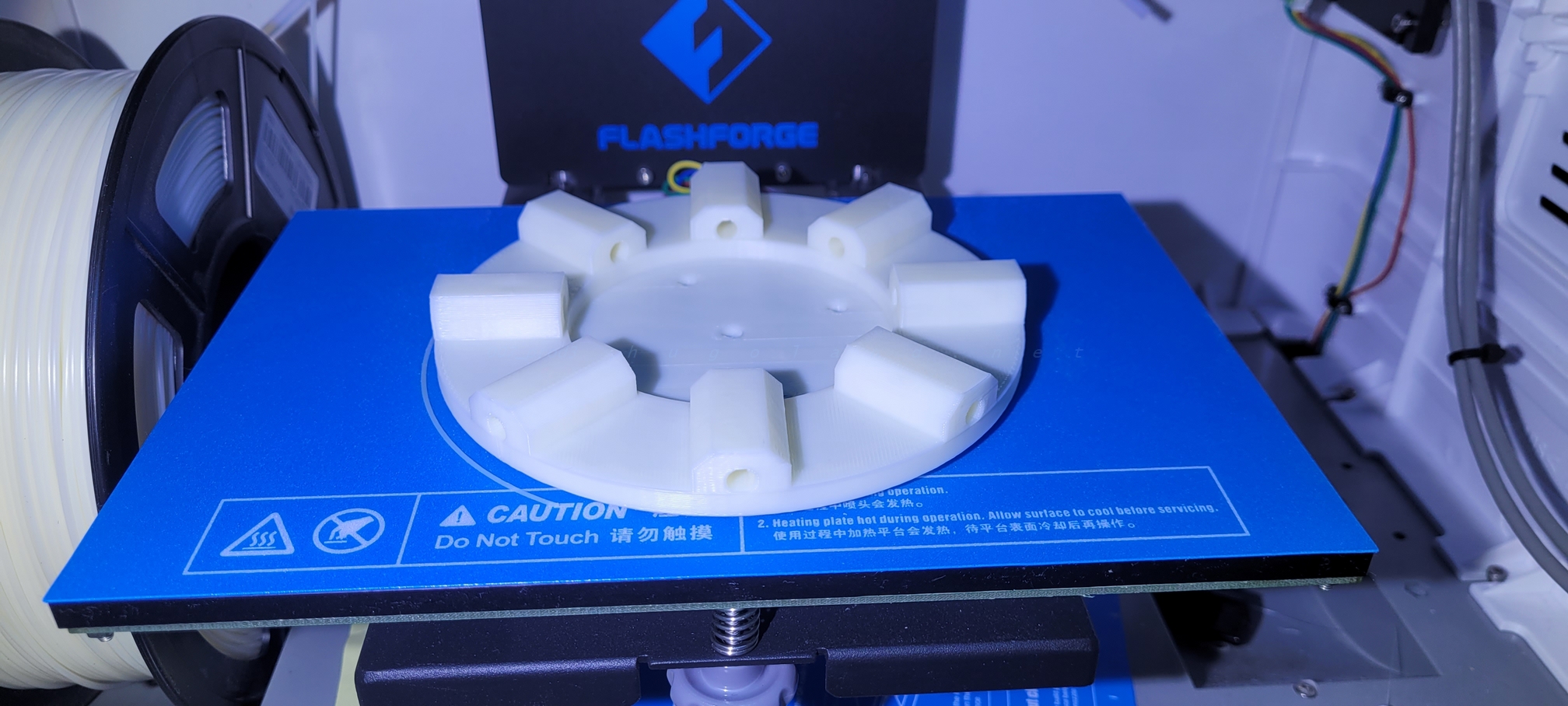 Ensuite, l'impression de la partie disque, contenant les éléments qui tiendront les radiales de la partie disque. J'ai prévu des trous pour passer les câbles et pour mettre des vis qui fixeront cette partie à l'autre pièce imprimée.
